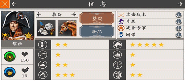 缪拉是法国军事家,是法国杰出的骑兵指挥官,起初是拿破仑一世的元帅,后成为那不勒斯国王。缪拉的骑兵能力是大家有目共睹的,首先骑兵指挥能力方面是5星,然后缪拉的四个技能-“攻击战术”、“奇袭”、“战争专家”、“间谍”。四个技能,唯独一个战争专家是个累赘。间谍能够对炮台和要塞的伤害增加,后期是一个打要塞的攻坚能手。如果缪拉的“战争专家”可以换成“突袭”就完美了,那样缪拉就是一个与蓝公主不相上下的骑兵将领!
