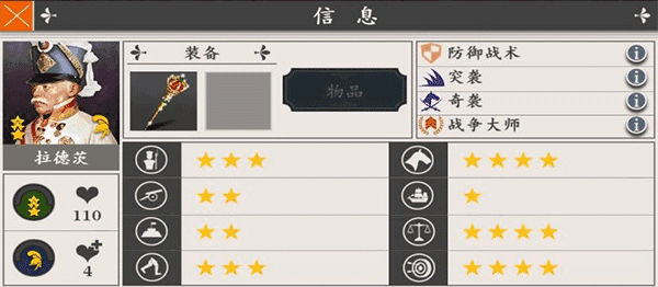 拉德茨,全名约翰·约瑟夫·文策尔·拉德茨基·冯·拉德茨,奥地利著名军事将领。拉德茨和缪拉在骑兵方面的才能可谓是针尖对麦芒,都是蓝公主以下的杰出军事将领。拉德茨的骑兵指挥能力是4星,不要紧,可以培养,问题不大。四个技能-“防御战术”、”突袭“、”奇袭“和”战争大师“。防御战术有一定几率降低受到的伤害,是个不错的防御技能。战争大师就比较鸡肋了,但拉德茨总体水平可居骑将顶尖!