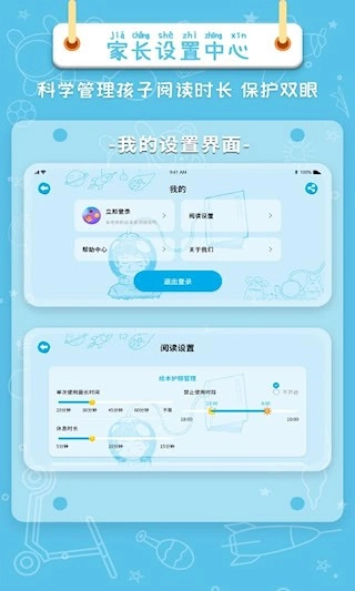 绘本星球软件的一大特色是使用时长管理功能。家长能够设置使用时间限制,一旦达到设定时长,软件就会自动开启休息模式,这样既能科学规划孩子的阅读时间,让孩子享受阅读乐趣,又能切实保护孩子的视力健康。