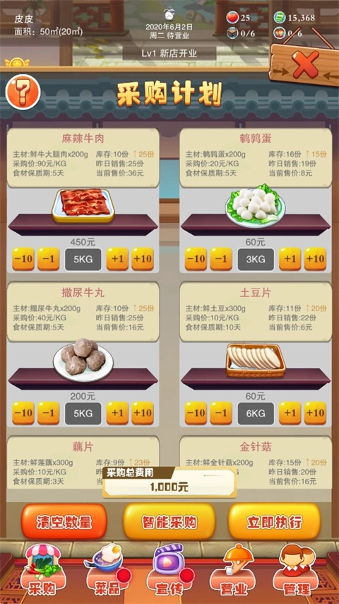 5五级之后,所有菜品都解锁了,基本没法手动调整,只能完全依靠智能采购了。