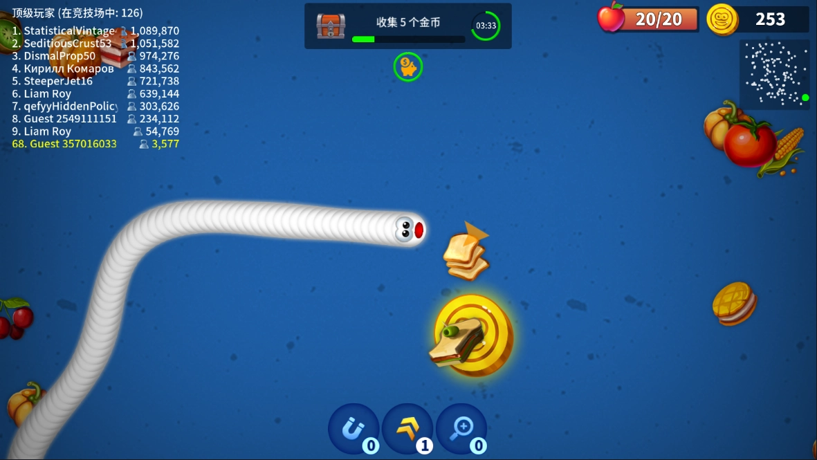 3、最后,在吞噬尸体时也得时刻留意突然冲过来抢食的其他贪吃蛇,要是对方实在太凶猛,那咱们还是先避让一下,保命才是首要的,留得青山在不愁没柴烧嘛。