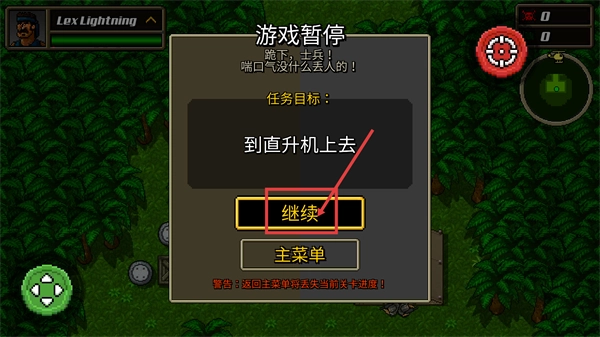 接到【任务目标:前往直升机】的指令后,在暂停界面点击【继续】,接下来优先朝着目标区域移动,以推进任务流程。