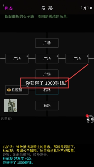 在【石路】场景触发与【小混混3】的互动,留意当前消耗的【1万功力】,后续要把控好资源消耗的节奏。