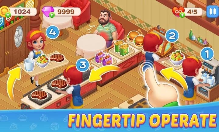 游戏的顾客特别多,你要努力打造世界一流的烹饪团队,并在这段惊险刺激的旅程中成长为美食大亨。