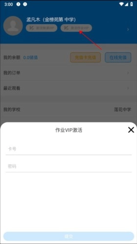 打开并登录新教育学生端后,进入“我的”页面,点击页面顶部的“激活作业VIP”(即下图红色箭头标注的区域),随后在底部弹出的对话框里输入老师提供的卡号与密码。