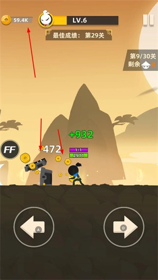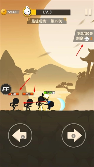 战斗过程中,火柴人对敌人发起攻击不仅能造成伤害,还能获得金币之类的奖励,同时界面会展示出最佳成绩等与关卡相关的信息。