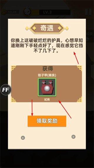 会有奇遇,可获得如锁子甲等装备,点击领取奖励获取,试用装备提升战斗防御等能力。