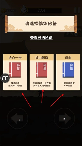 选择修炼秘籍,其中包含会心一击、排山倒海、吸血等技能,可助力战斗。