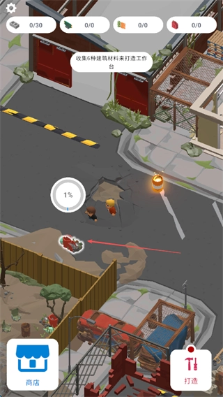 在废墟场景里搜寻建筑材料的资源点,点击这些资源点就能启动采集流程,采集过程中会出现像1%这样的进度条,资源会随着进度条的推进慢慢积攒起来。