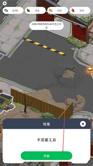 当遇到垃圾区域时,点击开启按钮,无需借助工具就能获取资源,持续积累各类资源,为建造建筑和制作工具打下基础。