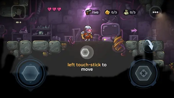 使用屏幕左侧的摇杆来操控英雄,右侧区域用于瞄准并维持攻击方向,箭头形状的图标对应的是跳跃功能。