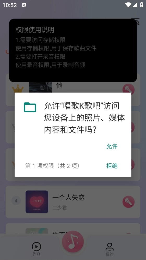 4、选择好想要唱的歌曲之后,点开右侧的话筒,开启相关的权限。