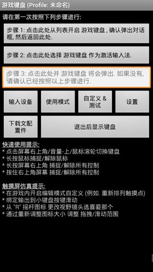 1、打开gamekeyboard游戏键盘,上面标明了快速使用提示和触摸屏仿真提示;