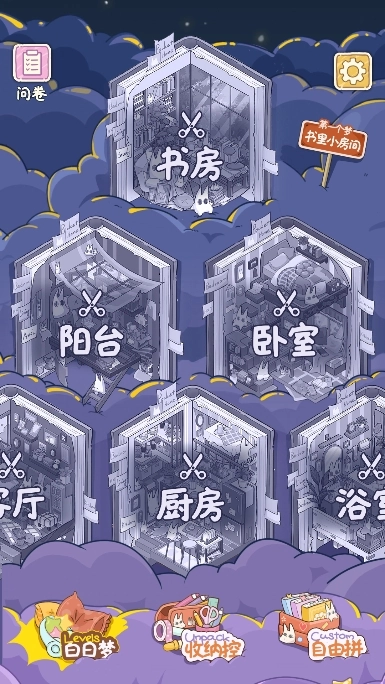 白日梦想屋游戏免费【03.25更新】是盏灯工作室推出的温馨治愈系休闲益智游戏。游戏中,玩家将为兔兔们的三层小别墅打造空间——可从卧室、书房、客厅、浴室、厨房、阳台等房间选择目标场景,通过将各类物品按对应区域收纳,还能自由调整家具的大小、颜色与摆放位置,最终打造出完全契合自己想象的理想空间。