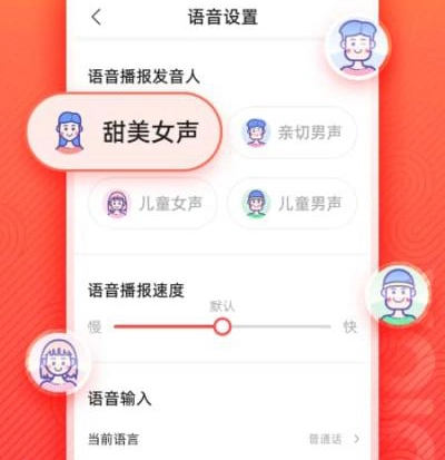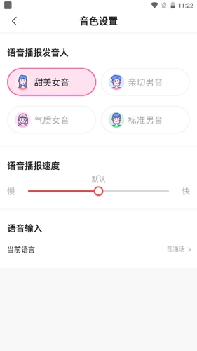 3、我们可以可按照自身喜好进行音色的设置,比如说设置成甜美女音、亲切男音等;还可以设置语音播报的速度;