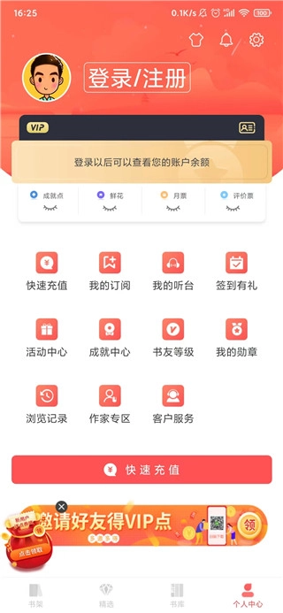 --【新增】福利活动上线啦!现在通过签到、阅读书籍、收听有声书完成指定任务,就能赚取金币;积累的金币可兑换VIP点、月票等丰富权益哦。