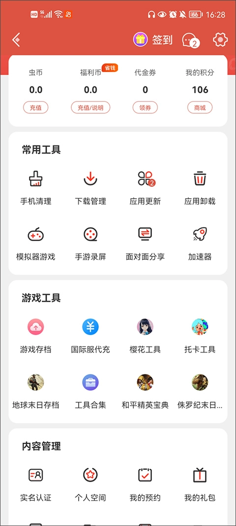 打开“我的”页面,能看到手机清理、设备管理、应用更新与卸载、游戏加速器等功能选项。