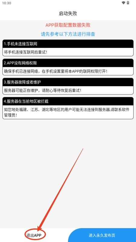 2、第一次进入应用,可能会失败,直接点击“退出”。