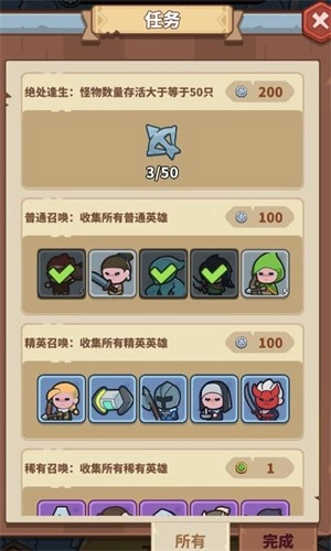 1、开局做任务立拿200银币,战斗中有各种任务,完成能拿奖励。战斗开始可以先忍忍不召唤,等怪物达到50(单人)/80(组队)后,再快速召唤英雄上场,这样可以完成【绝处逢生】任务直接先拿200银币。