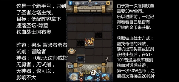 在圣堂关卡中,铁血冈布奥会遇到铁血战士的尸体,从尸体处能获取铁血之盔。拿到头盔后,再通过50层关卡,就会碰到铁血雕像。此时戴上头盔与雕像对话,并给予它50万多金币,就能得到铁血冈布奥了。
