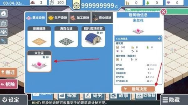进入建造界面后,可从基础设施、生产设施等不同类别里挑选想要建造的建筑,比如米兰花,选中该建筑即可启动建造流程。