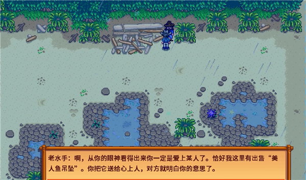 6、在升级农场、并修复沙滩右边的断桥后,在一个下雨的时间来到沙滩的潮汐池,找水手购买人鱼吊坠。