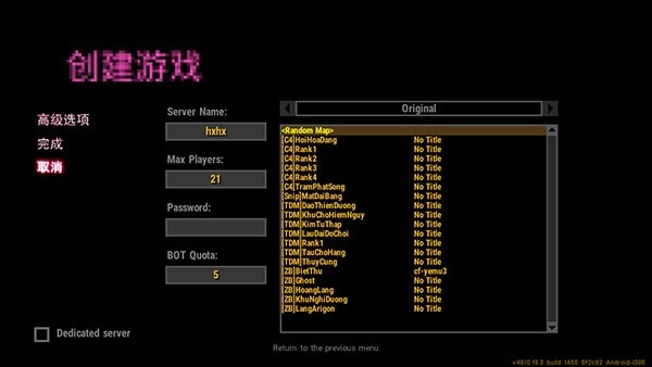 进入【地图选择】界面后,右侧会显示可供选择的地图列表,其中第一行是随机地图选项。选定该选项后,点击【完成】按钮即可。