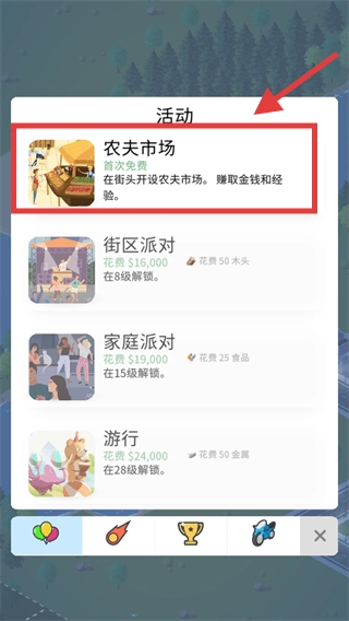 3、参与【活动】的【农夫市场】,首次免费,获取金钱与经验助力城市发展。