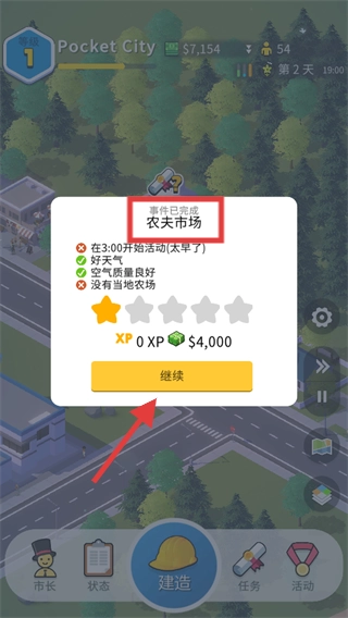 4、完成【农夫市场】活动后,点击【继续】领【$4,000】,积累资源建城市。