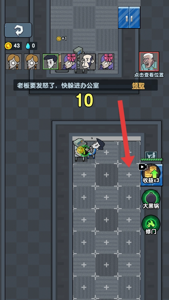2、注意“老板要发怒了,快躲进办公室”的提示,在倒计时结束前控制角色移动到办公室,躲避老板的怒火。