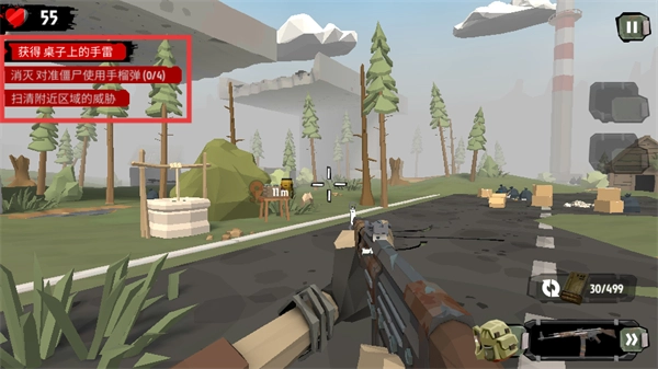 3、到达任务区域后,根据任务提示(如获得桌子上的手雷、消灭对准僵尸使用手榴弹、扫清附近区域的威胁),完成一系列目标。