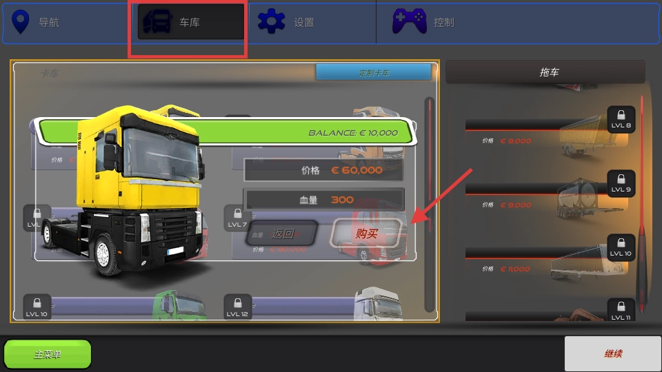 1、进入车库界面后,查看当前余额【€】-【10000】以及目标卡车的价格【€】-【60000】,通过积累资金购入属性更优的卡车,以此提高运输效率。
