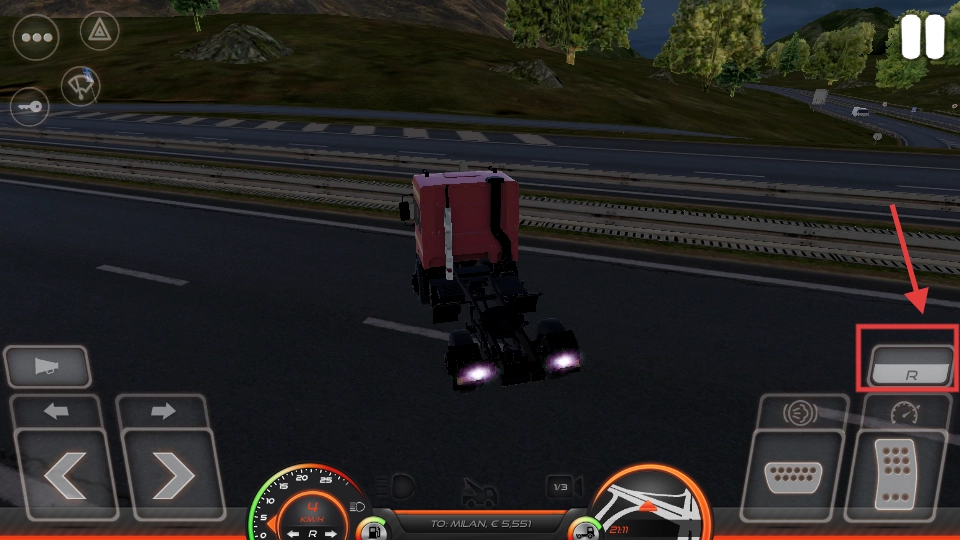 3、驾驶时需倒车,点击右侧【R】按钮切换倒车挡,调整车辆位置,便于装卸货或调整路线。