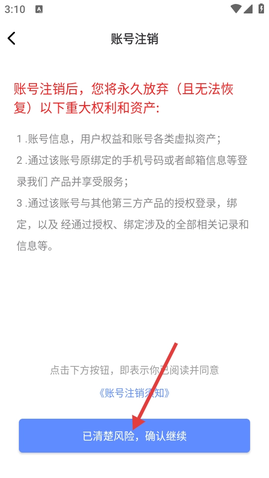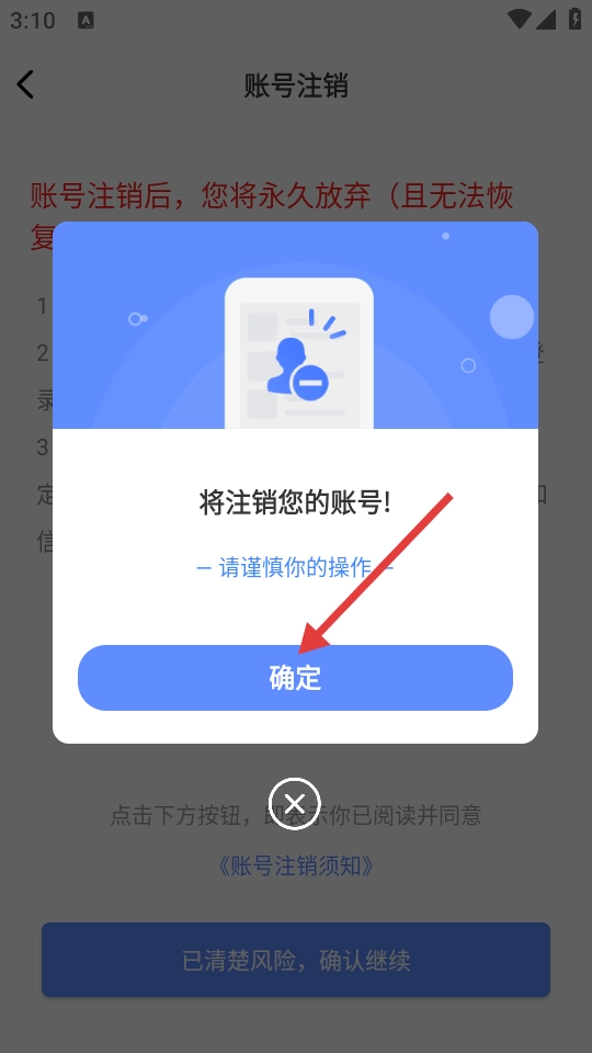 3、在账号注销说明页,点击【已清楚风险,确认继续】按钮,可进入注销确认弹窗。