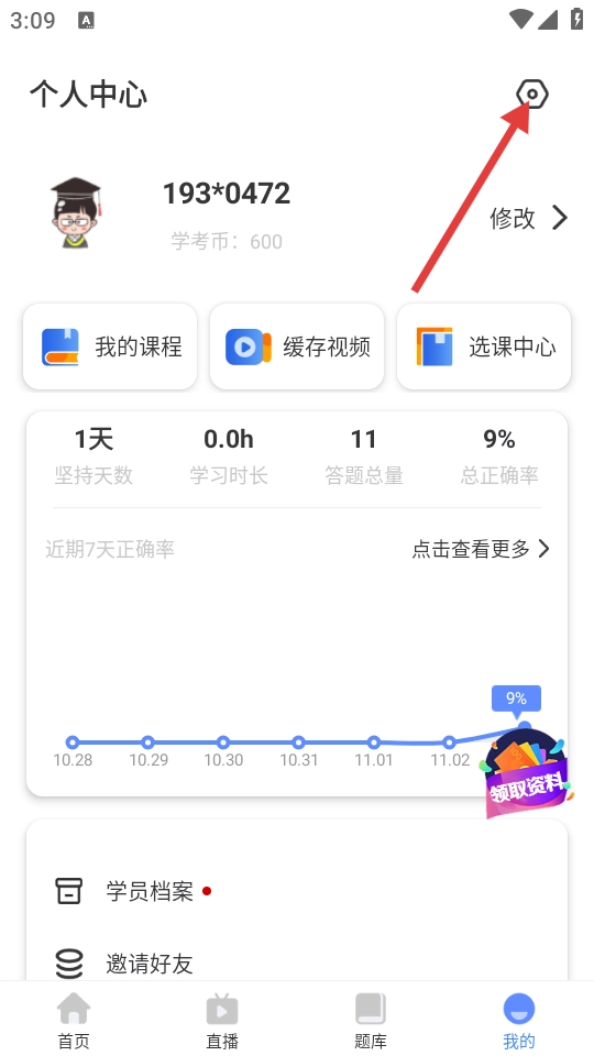 1、在个人中心界面,点击右上角设置图标,可进入设置功能页。