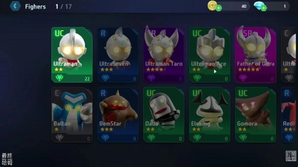 2、这款游戏共收录了17位奥特曼以及经典怪兽角色,每个角色都具备独特的技能动画与必杀特效,能让粉丝在战斗过程中重温系列作品的辉煌瞬间。