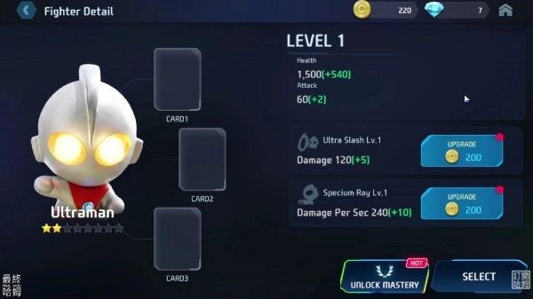 2、通过剧情任务和挑战关卡,收集角色碎片与技能卡,逐步组建你的奥特曼梦之队。
