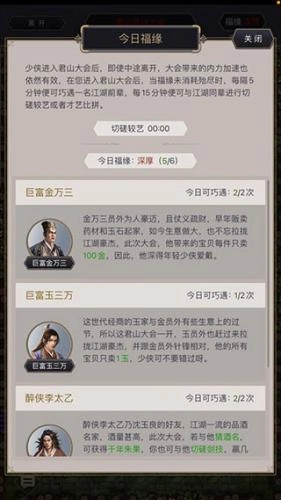 首先是内力,之前我们也提过,君山能让玩家额外获得不少内力。君山的内力获取量,和你当前的内力等级以及邀请的名宿等级相关——当前升级需要的内力越多,能从君山拿到的内力也越多。而且每届君山的内力获取量都有波动,就算是同一个玩家在同一等级,不同届君山得到的内力也会不一样。 其次是珍稀道具,打开君山界面后,点击右上角就能查看福源奇遇任务。不同的奇遇对应不同效果,能帮你获取珍稀道具,还可以用八卦符增加福源次数。 最后是切磋,在君山里面和其他玩家切磋,能获得武学熟练度。要是觉得演武场的提升速度不够快,来这里切磋可以加快你对武学的掌握进度。