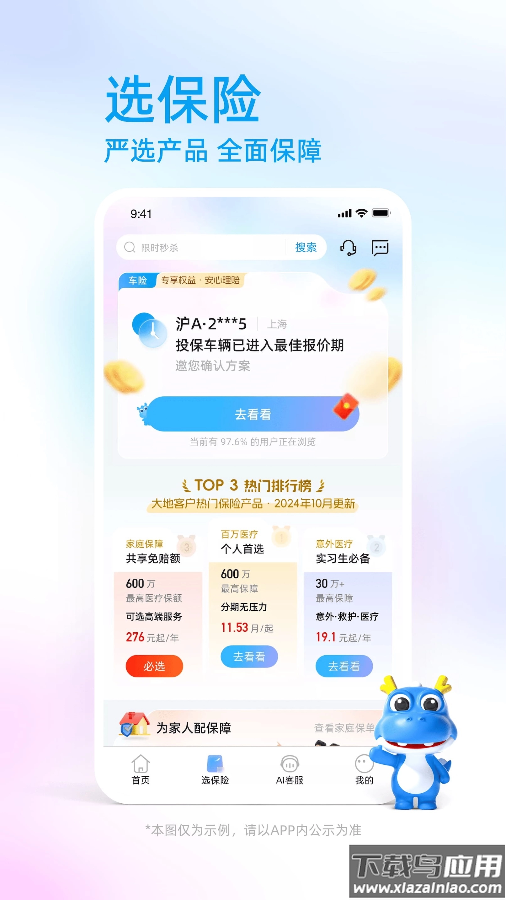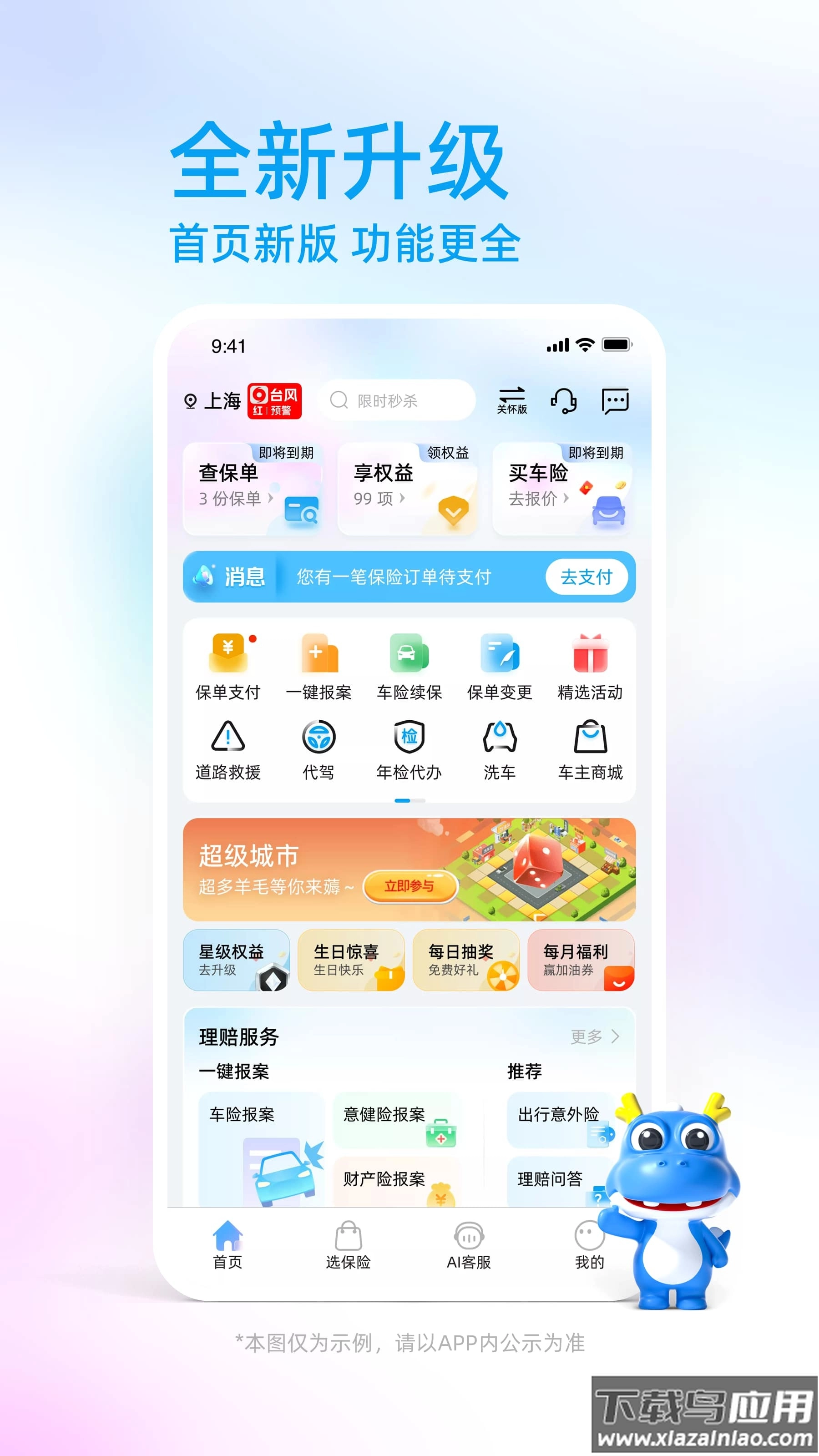 该平台为广大用户提供涵盖用车养车、生活服务等在内的近三十项增值服务;与此同时,还支持线上投保、电子保单查询、在线理赔办理、智能客服咨询以及线下网点查找等全流程保险服务。
