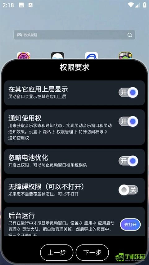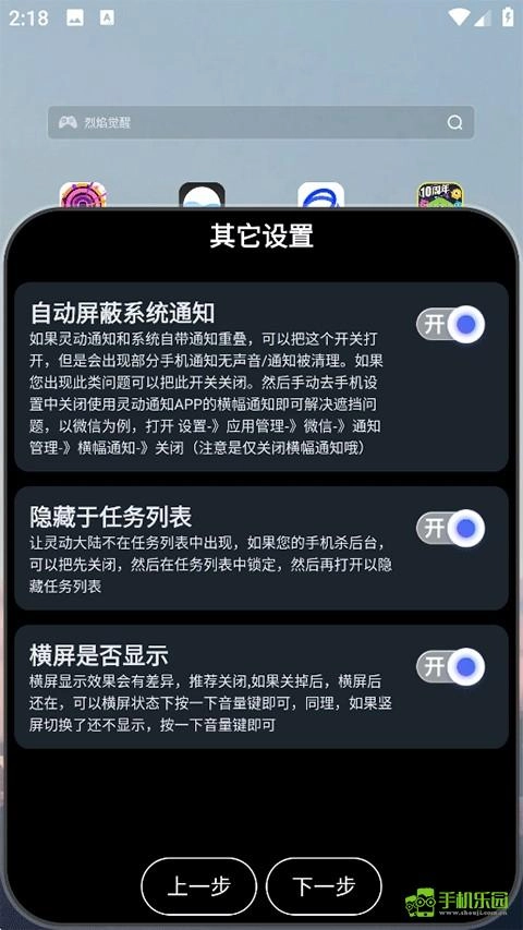 其他设置项包括自动屏蔽系统通知、在任务列表中隐藏自身、横屏状态下是否显示等,完成这些设置后可继续下一步操作。