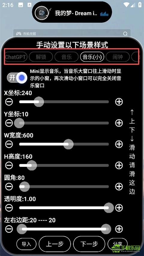 在上方预览各插件的灵动岛效果,下方可调整灵动岛的坐标位置、宽高尺寸、形状透明度及边距等参数,随后进行下一步操作。
