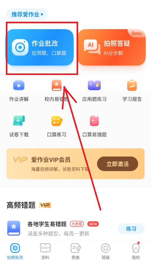 打开软件后,找到“拍照批改”页面,点击左上角的“作业批改”按钮。