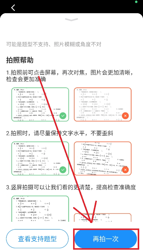 批改后的作业会立即展示出来,若还有需要,您可以点击“再拍一次”按钮重新提交。
