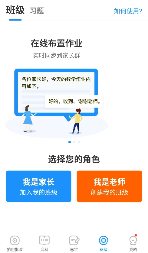我是老师,能创建班级,在线布置作业,相关内容会实时同步到家长群里。