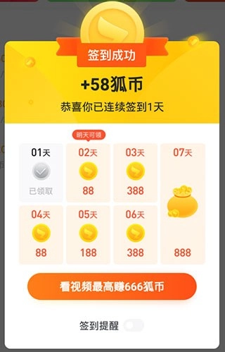 每天完成签到都能领取一定数量的狐币奖励,而且连续签到的天数越多,获得的狐币也会相应增加;要是担心忘记签到,还可以开启签到提醒功能。