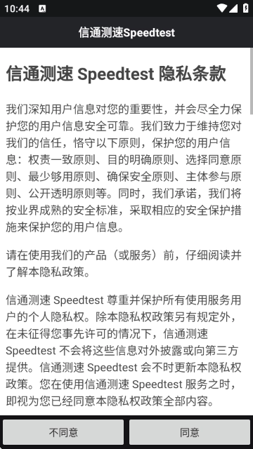 打开后,首先会弹出“信通测速 Speedtest 隐私条款”页面,仔细阅读完毕后点击“同意”按钮;若选择点击“不同意”,则无法使用相关功能。