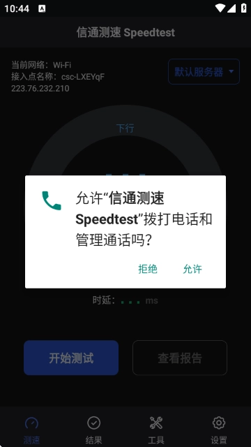 进入主界面后,系统会请求“拨打电话和管理通话”权限,您可根据自身需求选择“允许”或“拒绝”(此权限主要用于检测网络状态,不会对核心测速功能造成影响)。