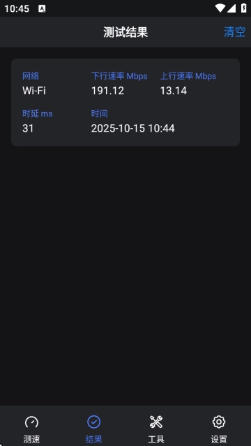点击底部的“结果”标签,就能查看所有历史测速记录,其中包含网络类型、上下行速率、时延以及测试时间,便于回溯网络性能的变化情况。