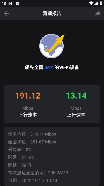测速结束后,进入“测速报告”页面,就能看到下行速率、上行速率、时延、丢包率等关键数据,还能与全省、全国的平均速率进行对比,知晓自己的网络在全国处于什么位次(比如“超过全国46%的Wi-Fi设备”)。