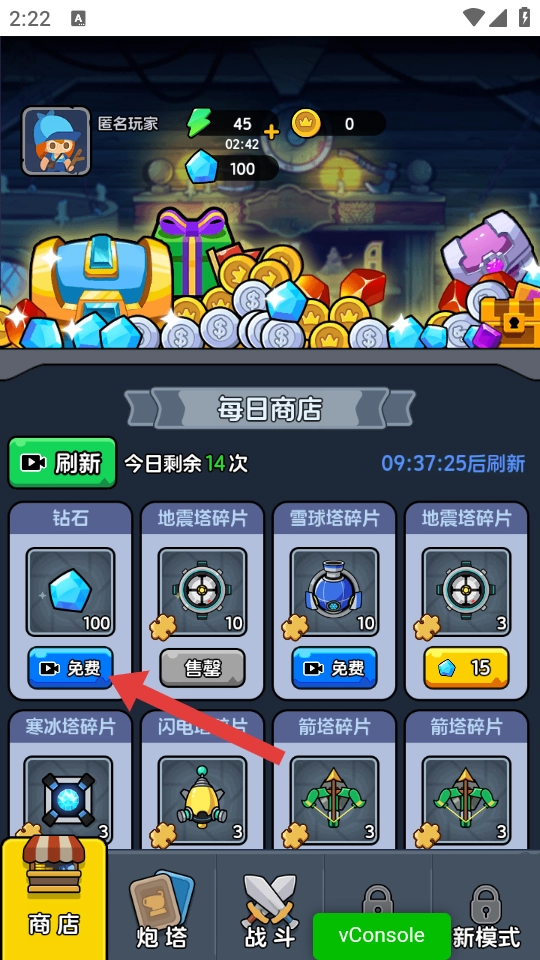 2、在商店界面里,点击【免费】可直接领取钻石。